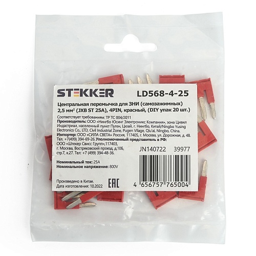 Характеристики Центральная перемычка для ЗНИ самозажимных 2,5 мм² (JXB ST 2,5) 4PIN LD568-4-25 (DIY упак 20 шт),STEKKER