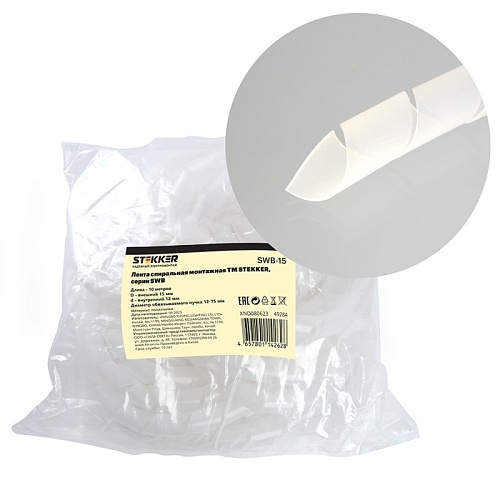 Характеристики Лента спиральная монтажная STEKKER, диаметр пучка 12-75 мм, 10 м/упак, белый, SWB-15