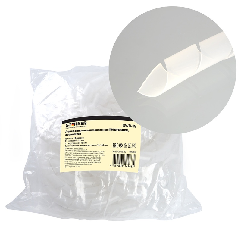 Характеристики Лента спиральная монтажная STEKKER, диаметр пучка 15-100 мм, 10 м/упак, белый, SWB-19