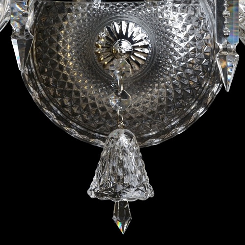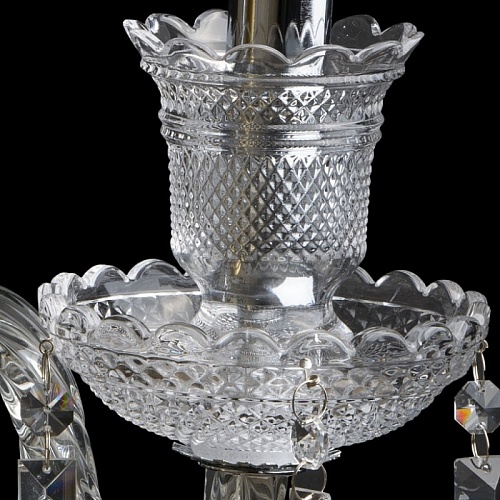 Арматура светильника из сплава металла, гальванизирована в цвет хрома, декорирована прозрачным хрустальным стеклом грановитой огранки. Розетки и декор центральной оси выполнены в одном стиле. Витые рожки произведены гутным способом. Светильник декорирован подвесками из хрусталя F&D 3-х видов оригинальной огранки и оригинальными декоративными элементами.