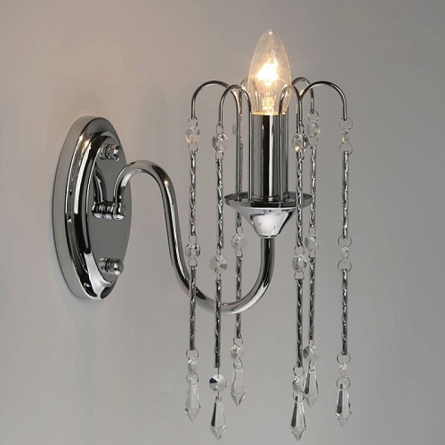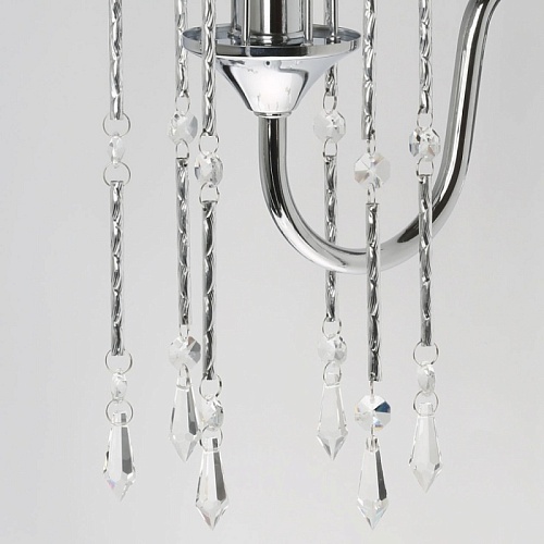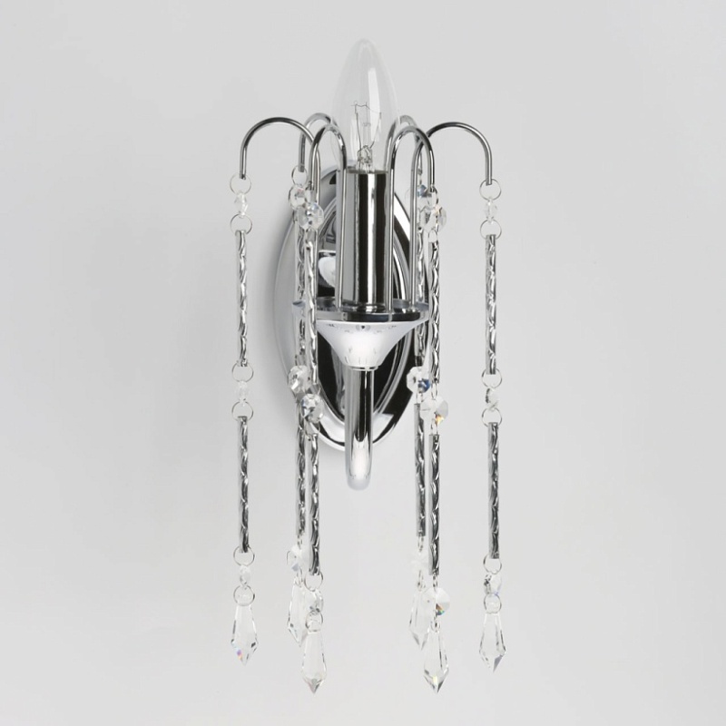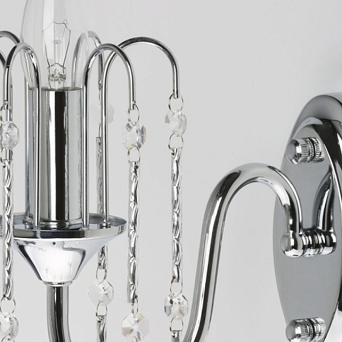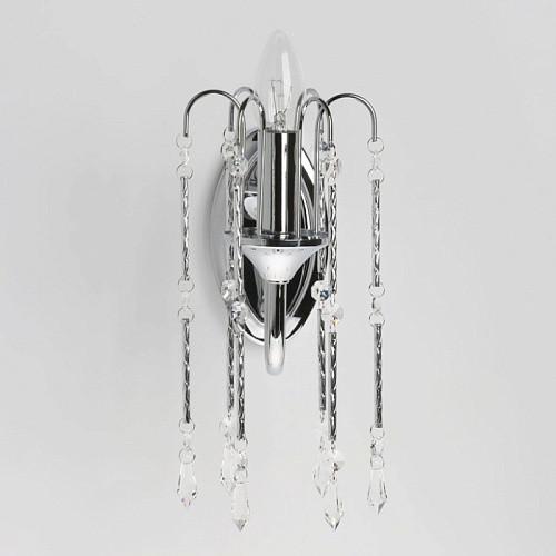 Металлическое основание бра гальванизировано в цвет хрома. Бра декорировано прозрачным хрусталем каплевидной формы и витыми элементами из сплава алюминия с лазерной насечкой.