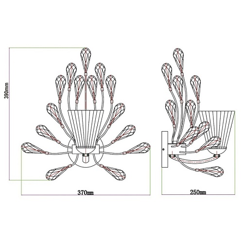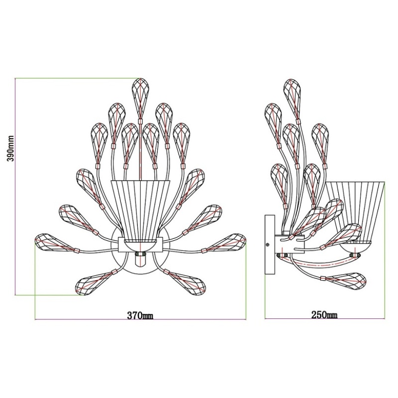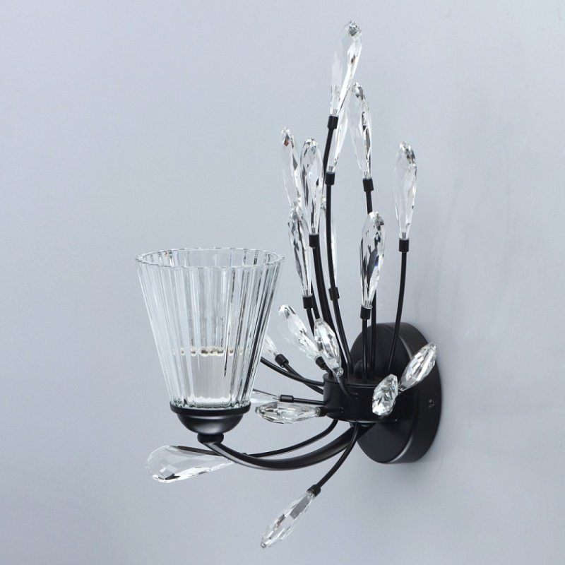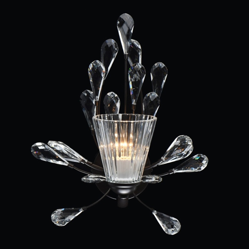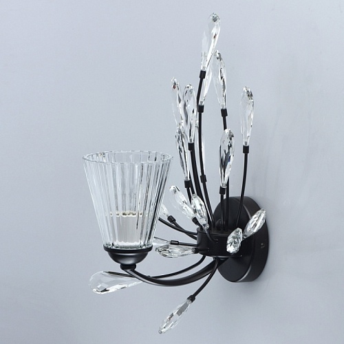 Основание бра выполнено из металла и окрашено в коричневый цвет. Фактурный толстостенный стеклянный плафон отлит в сложную форму. Светильник декорирован прозрачным хрусталем оригинальной формы.