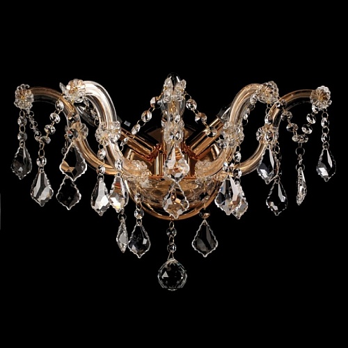 Арматура выполнена из сплава металла, с последующей гальванизацией в цвет французского золота. Рожки декорированы рифленным прозрачным стеклом, отлитым по форме рожков. Светильник декорирован подвесами из прозрачного хрусталя сложной огранки.