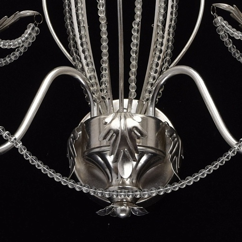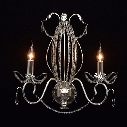 Основание настенного бра выполнено из металла и покрыто сусальным серебром. Светильник декорирован бусами из прозрачного хрусталя и хрустальными подвесками формы капля.