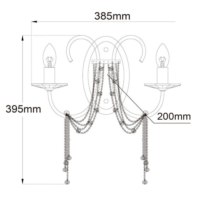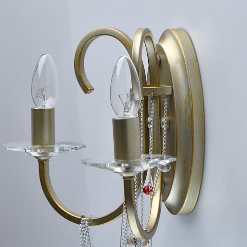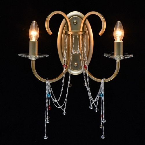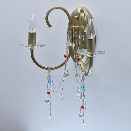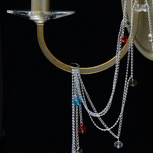 Основание светильника выполнено из металла и обработано по технологии хай-лайт, где основной слой цвета перламутрового серебра, а декоративный слой цвета коричневой патины. Декор из цепочек серебряного цвета и хрустальных бус синего, красного цветов, цвета шампань и прозрачных.
