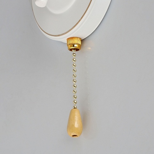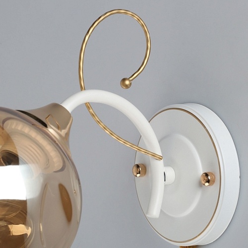 Основание бра выполнено из металла и окрашено в белый цвет. Отдельные элементы основания гальванизированы в цвет золота. Стеклянный плафон сложной формы гальванизирован в цвет шампань.