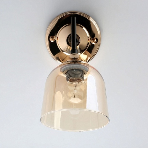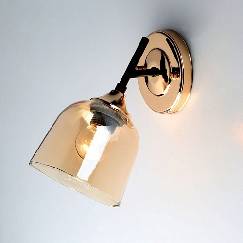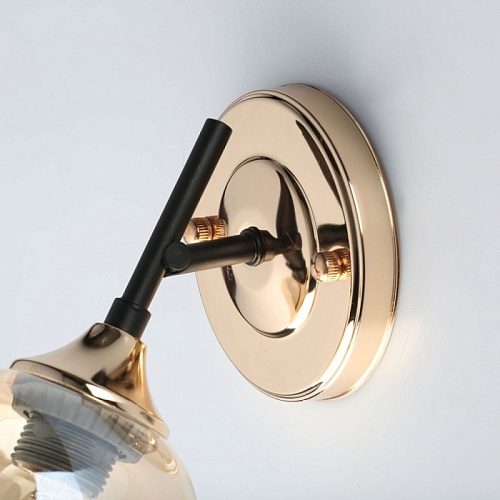 Основание бра выполнено из металла и окрашено в черный цвет. Отдельные элементы основания гальванизированы в цвет золота. Стеклянный плафон гальванизирован в цвет шампань.