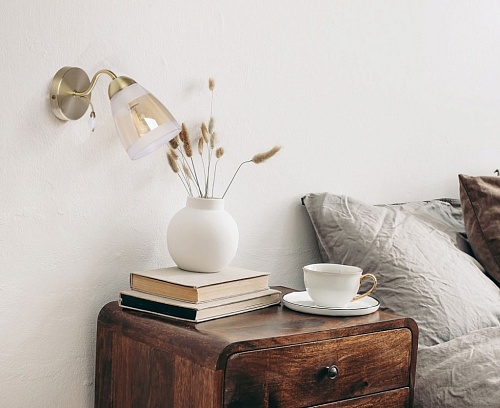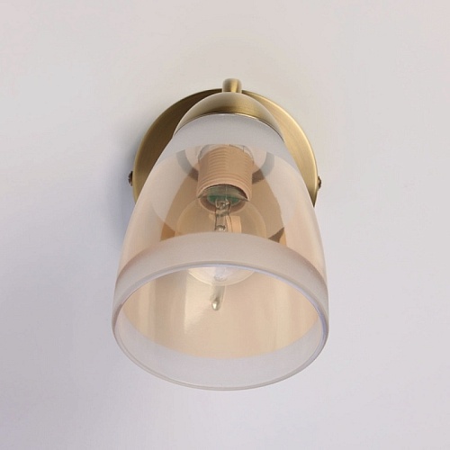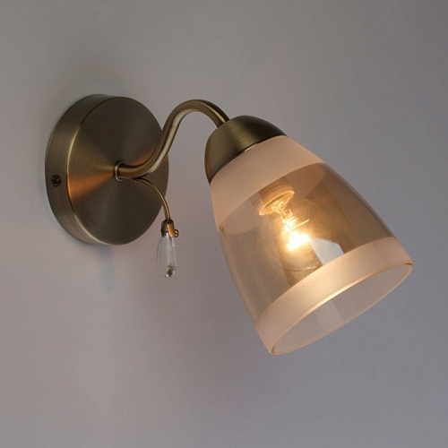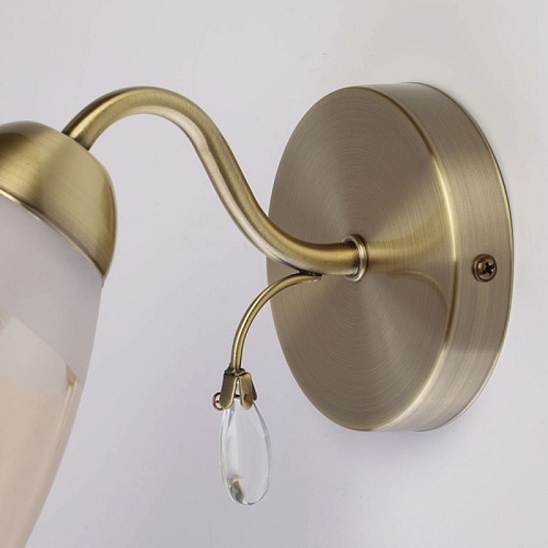 Металлическое основание настенного бра гальванизировано в цвет античной бронзы. Стеклянный плафон матирован по трафарету и гальванизирован в цвет шампань. Настенное бра декорировано прозрачным хрустальным стеклом.
