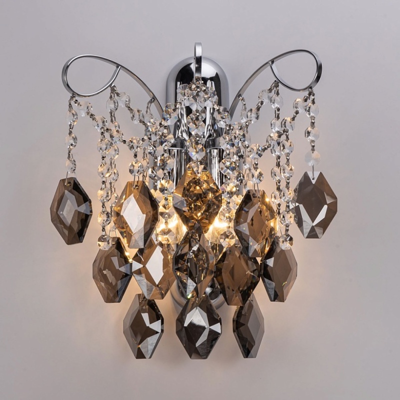 Металлическое основание гальванизировано в цвет хрома. Вертикальное настенное бра декорировано хрусталем формы ромбов, гальванизированным в дымчатый цвет и прозрачным хрусталем в форме октагонов.