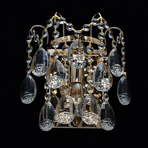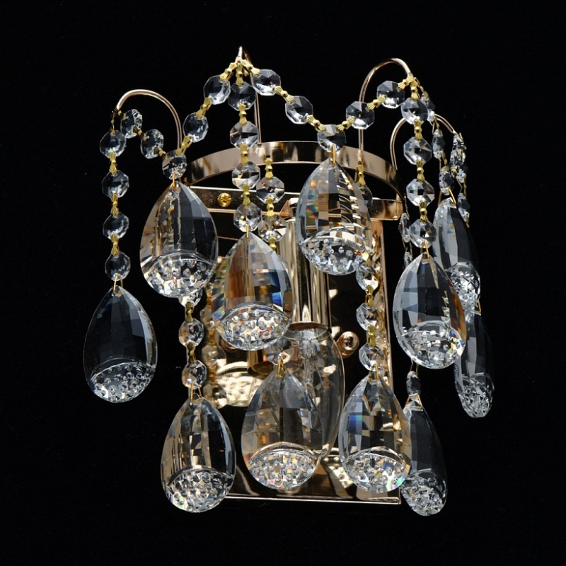 Основание светильника выполнено из металла и гальванизировано в цвет золота. Светильник декорирован прозрачным хрусталем формы октагон и миндаль с насечками, выполненными алмазным резцом.