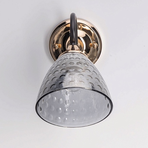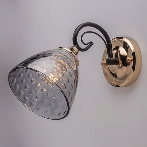 Металлическое основание настенного бра гальванизировано в цвет золота. Отдельные элементы окрашены в цвет кофе. Светильник декорирован выдувным в форму стеклянным плафоном, гальванизированными в дымчатый цвет.