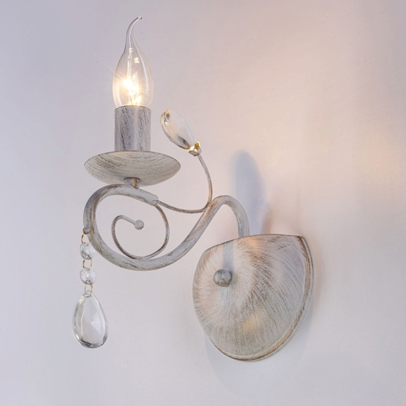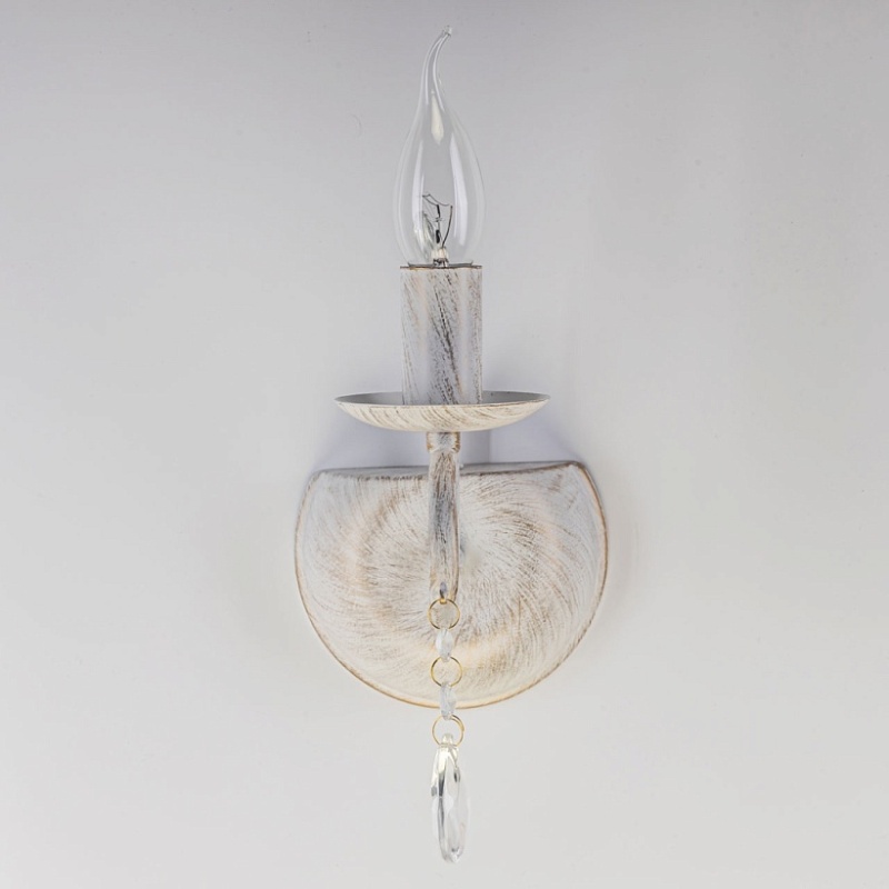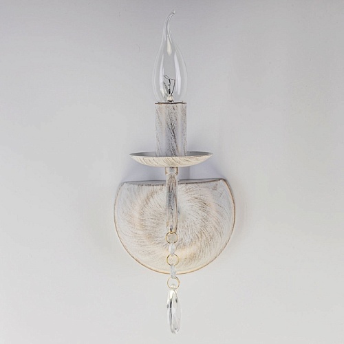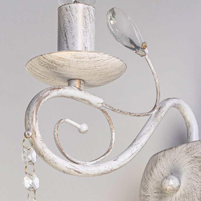 Металлическое основание светильника окрашено в белый цвет и обработано по технологии хай-лайт в золотой цвет. Настенное бра декорировано стеклянными подвесами миндалевидной формы.