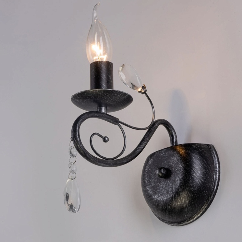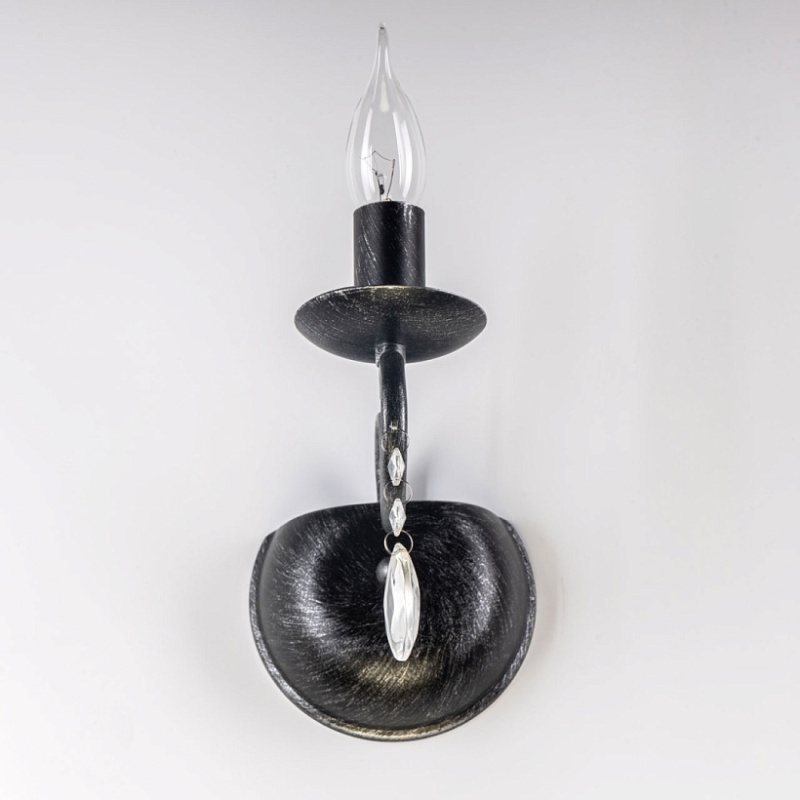 Металлическое основание бра окрашено в черный цвет и обработано по технологии хай-лайт в серебряный цвет. Настенное бра декорировано стеклянными подвесами миндалевидной формы.