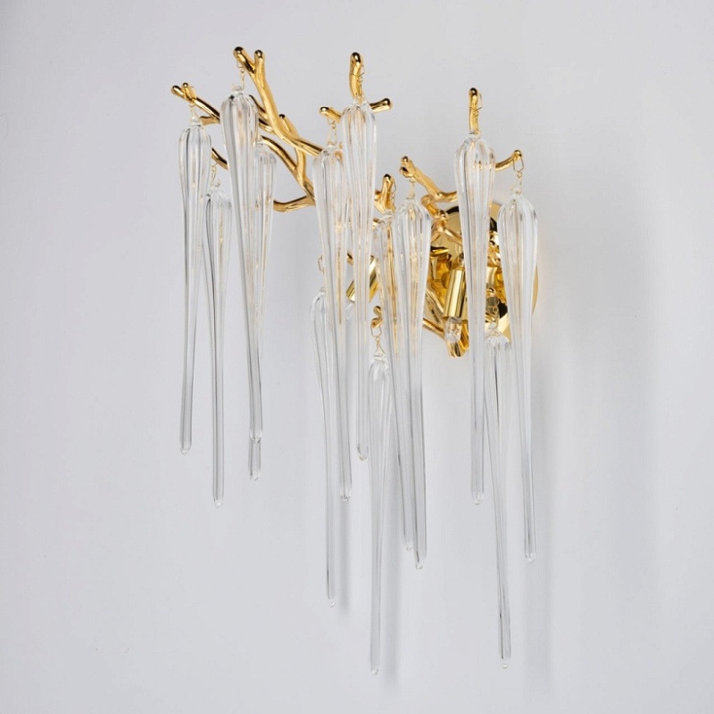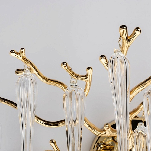 Основание настенного бра выполнено по технологии художественного литья из сплава алюминия с цинком и гальванизировано в цвет золота. Настенное бра декорировано прозрачным стеклом вытянутой формы.