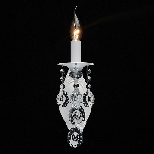 Основание светильника выполнено из металла и окрашено в белый цвет. Светильник декорирован прозрачным хрусталем оригинальной формы.