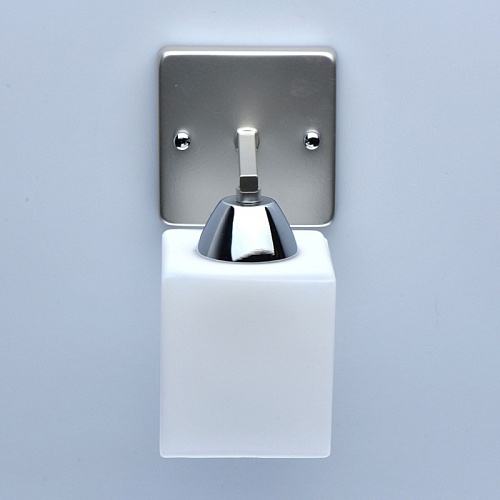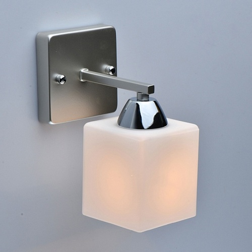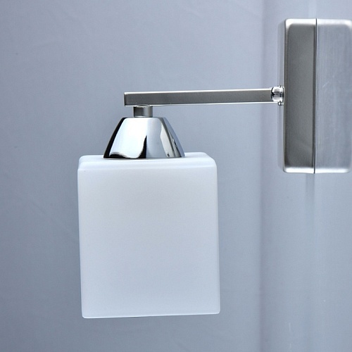 Основание светильника выполнено из металла и окрашено в цвет перламутрового серебра. Отдельные элементы основания гальванизированы в цвет хрома. Светильник декорирован стеклянными плафонами, окрашенными в белый цвет с внутренней стороны.