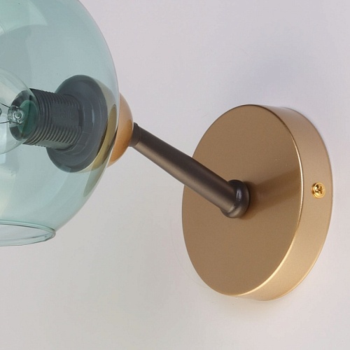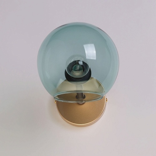 Металлическое основание настенного бра гальванизировано в цвет матового золота. Рожок бра окрашен в темно-коричневый цвет. Стеклянный плафон окрашен в массе в зелено-голубой цвет и выдувается вручную в форму. Край плафона оплавлен.