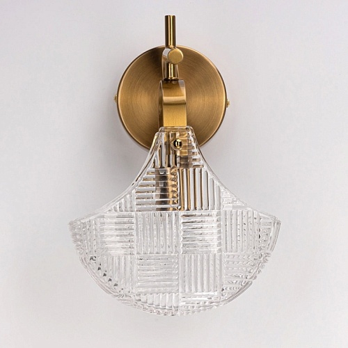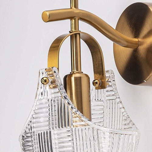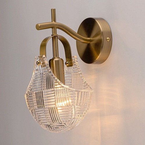 Металлическое основание настенного бра гальванизировано в цвет бронзы. Горизонтальное бра декорировано плафоном оригинальной формы из прозрачного фактурного стекла, отлитого в сложную форму.