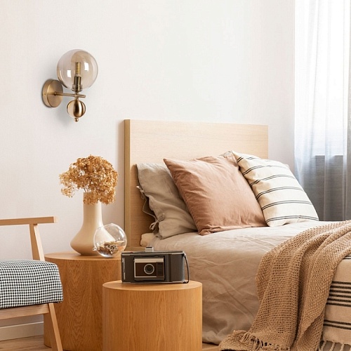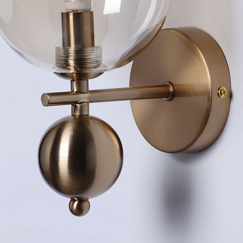 Металлическое основание настенного бра гальванизировано в цвет медовой бронзы. Источник света закрыт стеклянным плафоном, гальванизированным в цвет топаза.