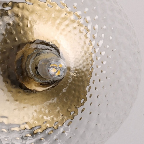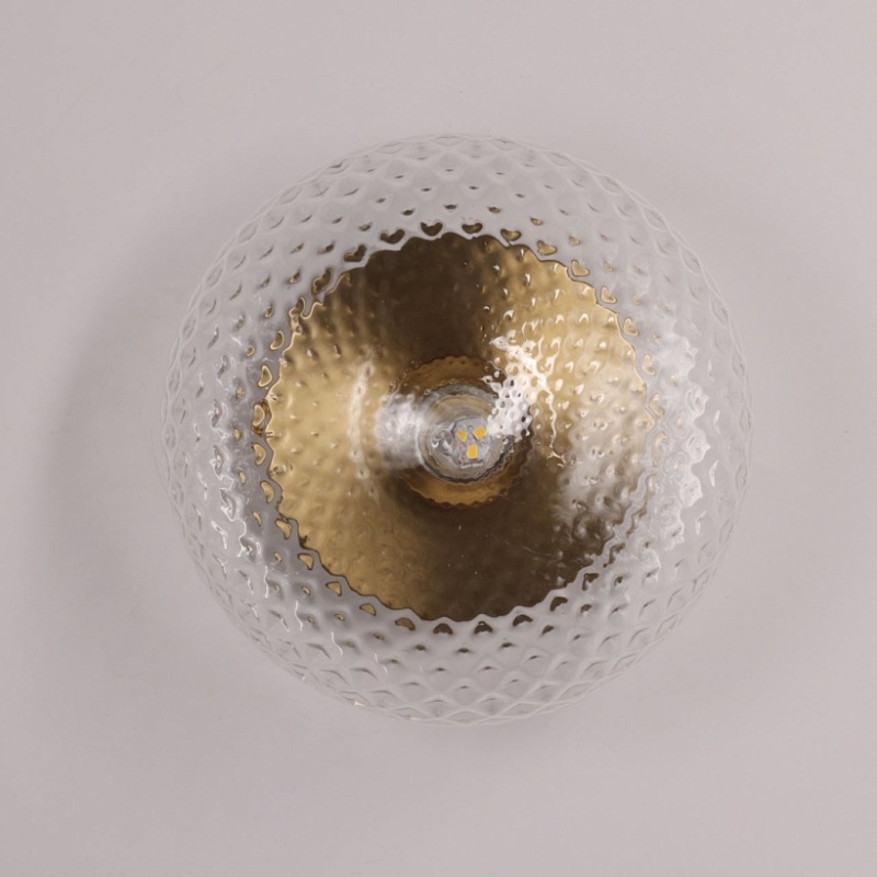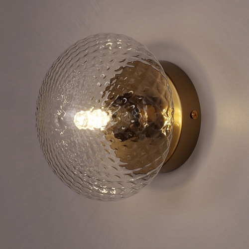 Металлическое основание настенного бра гальванизировано в цвет латуни. Светильник декорирован полусферой из прозрачного фактурного стекла.