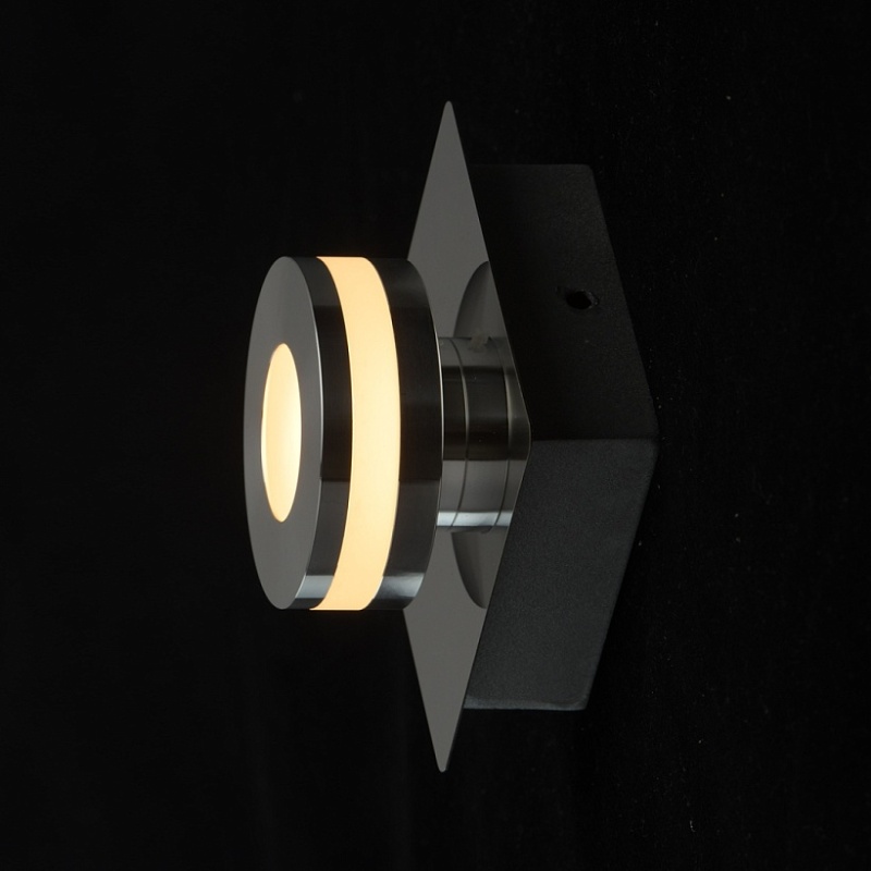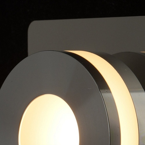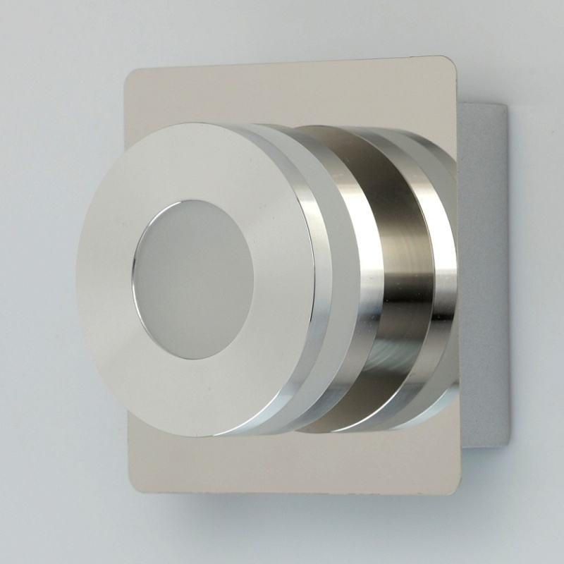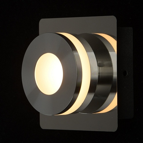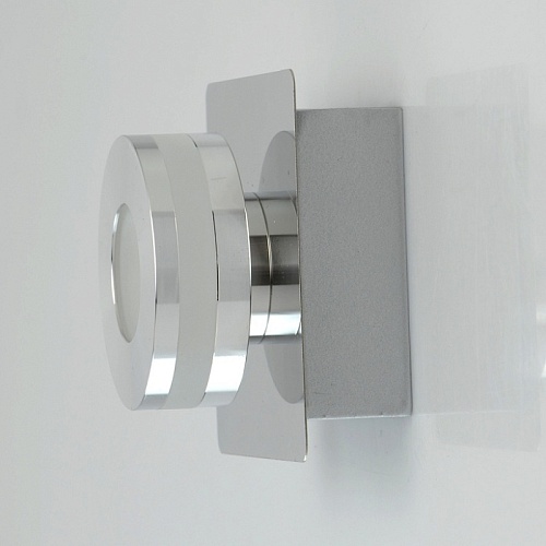 Основание выполнено из металла и гальванизировано в цвет хрома. Корпус закрыт пластиной из нержавеющей стали, отполированной до зеркального блеска.Плафон: сплав алюминия, гальванизация в цвет хрома. Светодиодный источник света типа COB закрыт рассеивателем из матового акрила.