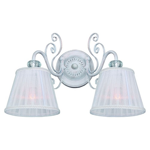 Металлический каркас состаренного белого цвета с золотом, абажуры из белой органзы, декор из прозрачного хрусталя.