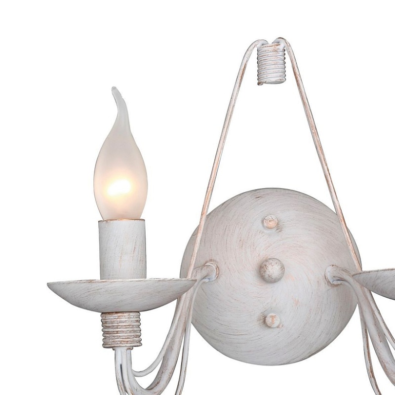 Металлический каркас состаренного белого цвета с золотом, сменные лампы в виде пламени свечи, регулируемая высота.