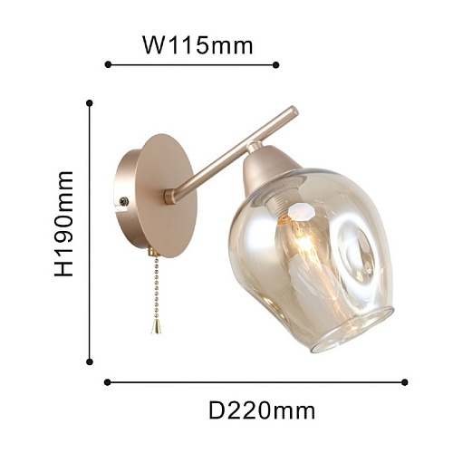 Металлический каркас золотого цвета, плафон из стекла в цвете шампанского, выключатель на корпусе, сменная лампа.