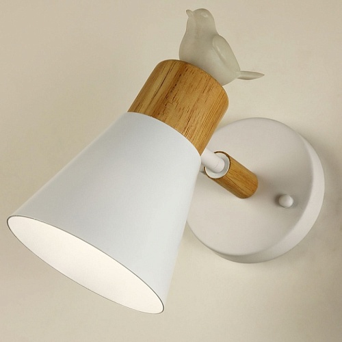 Металлический каркас матового белого цвета, декоративные вставки из светлого дерева, декоративный элемент в виде белой акриловой птицы.