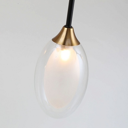 Металлический каркас черного цвета, декоративные элементы в цвете латунь, двуслойный плафон из белого и прозрачного стекла.