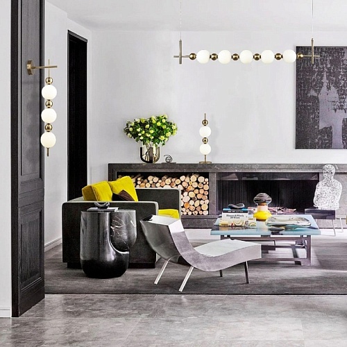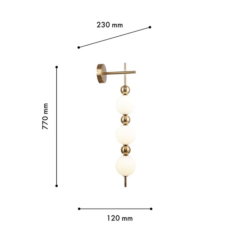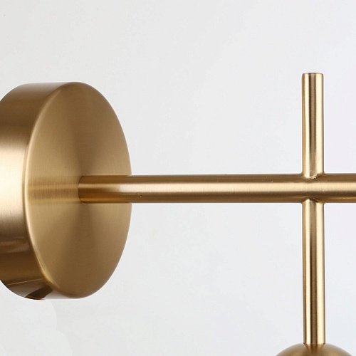 Металлический каркас в цвете латунь, плафоны из белого непрозрачного стекла, декор в виде золотых шаров.