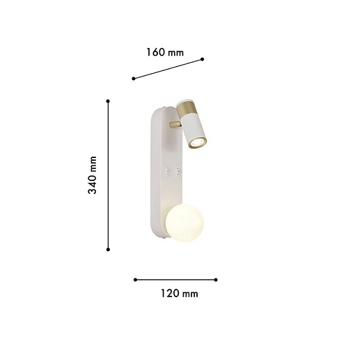 Металлический каркас белого матового цвета, вставки золотого матового цвета, плафон из белого акрила, два источника света, оснащен выключателем.