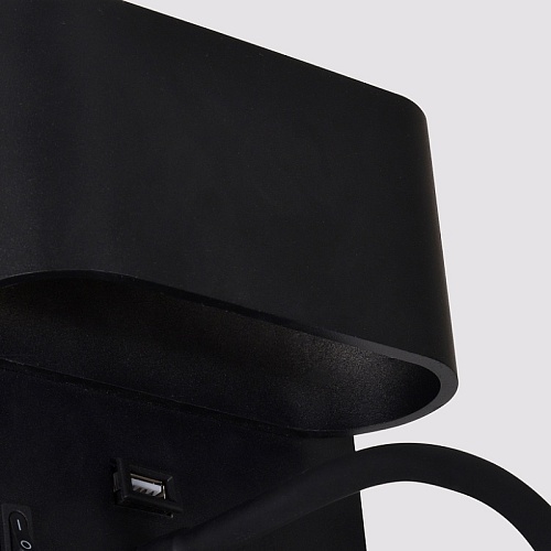 Металлический каркас в черном цвете оснащен двумя источниками света: модуль LED внутри плафона и спот на гибком проводе, отдельные выключатели для каждого источника света, зарядный USB порт.
