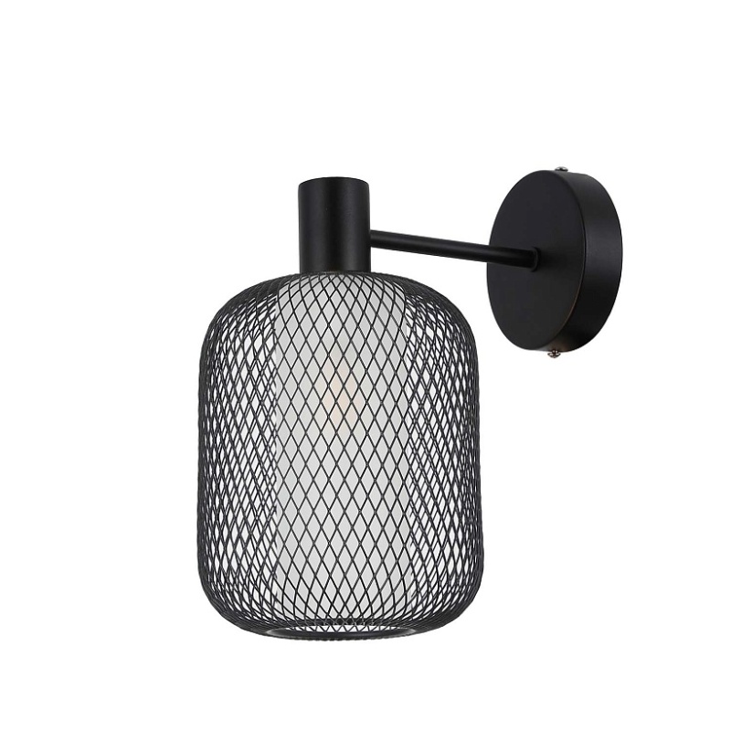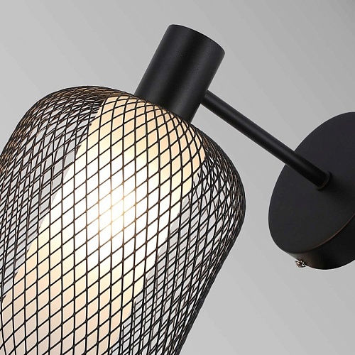 Каркас из металла черного матового цвета, двойной абажур из металлической сетки и стекла, цоколь E14.
