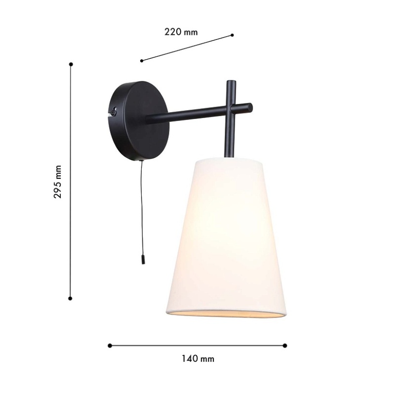 Каркас из металла черного матового цвета, белый тканевый абажур, выключатель на чашке крепления, цоколь Е14.