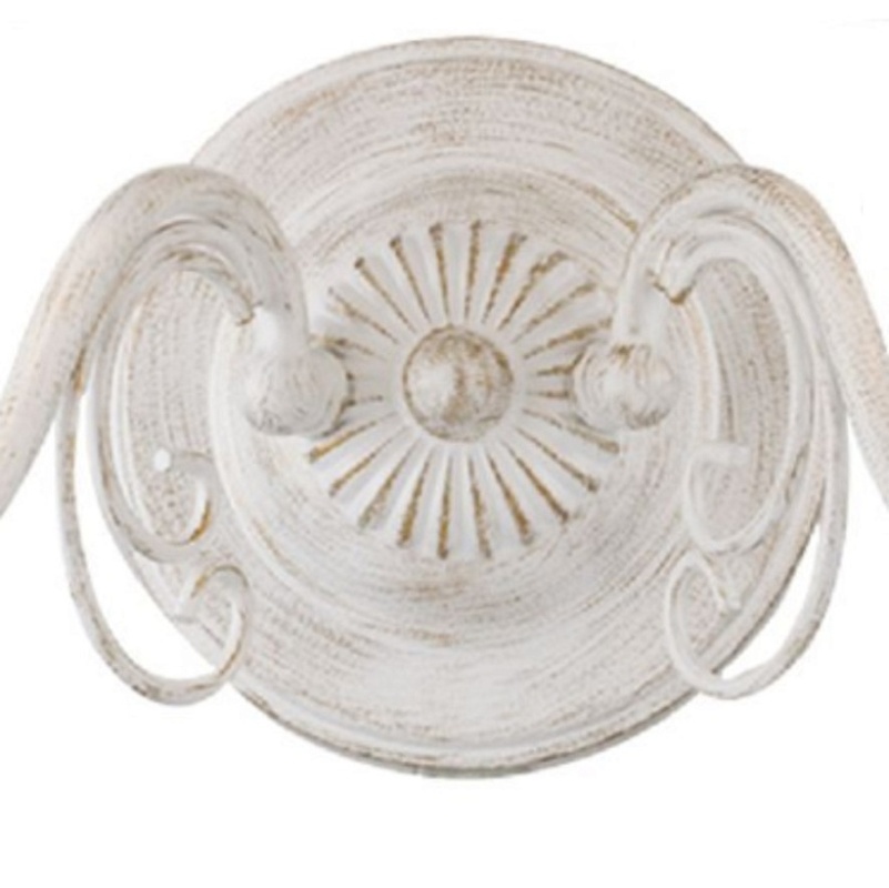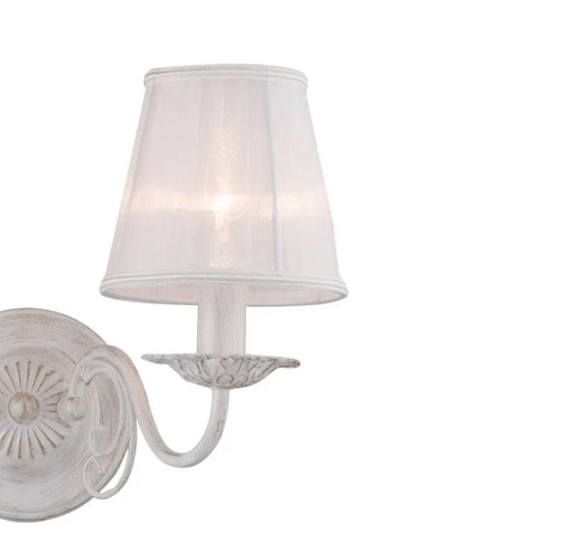Каркас окрашен в белый цвет с золотой патиной, тканевый абажур из белой органзы украшен белой тесьмой.