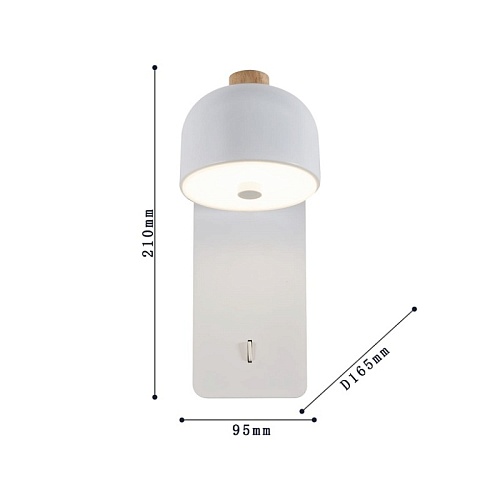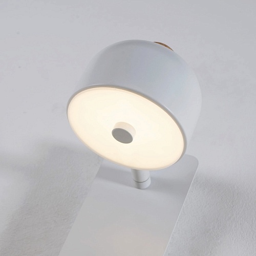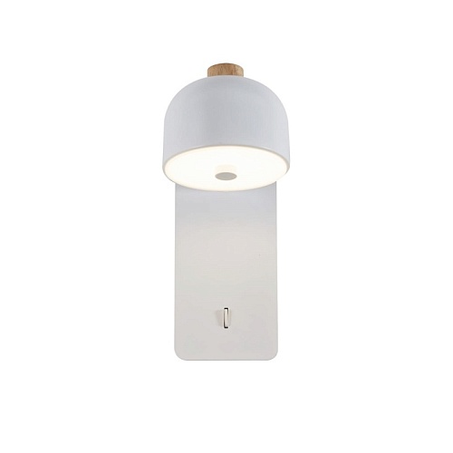 Металлический каркас белого цвета, поворотный плафон, декорирован деревянным элементом, акриловый матовый рассеиватель, выключатель на корпусе, LED-модуль.