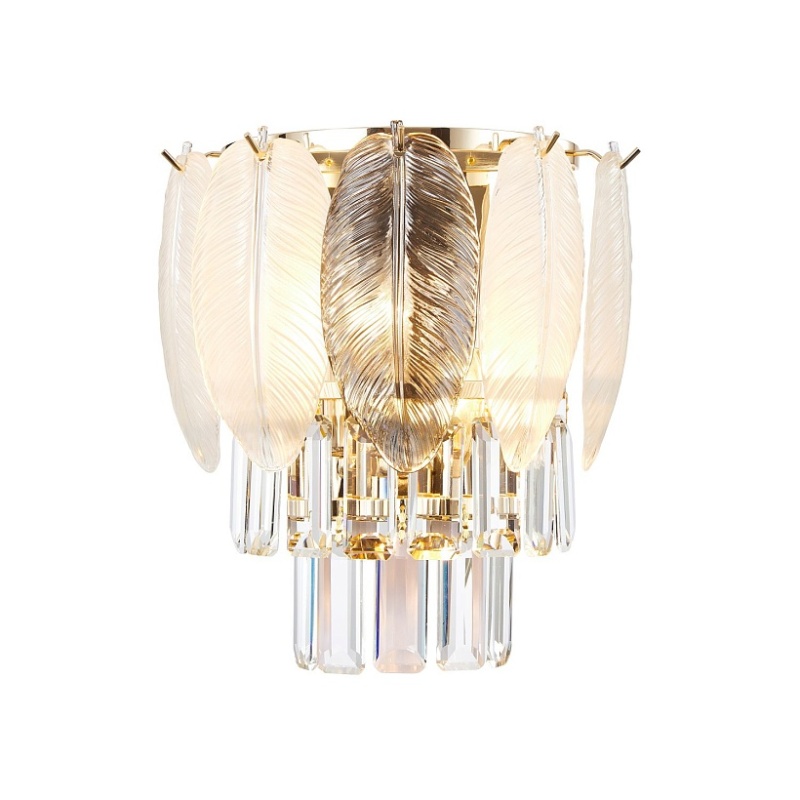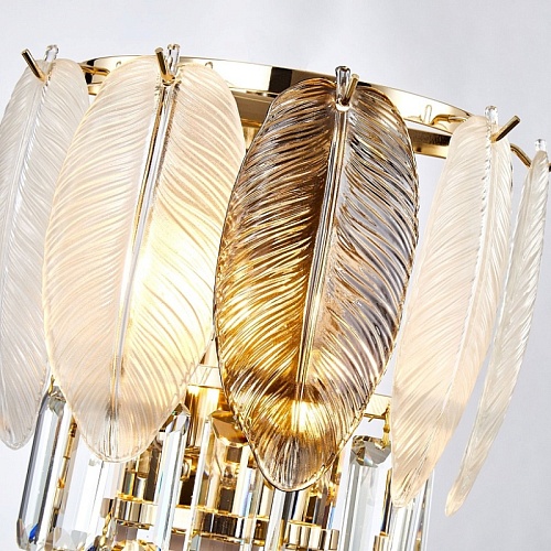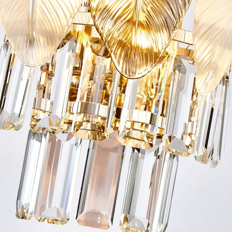 Каркас цвета золотой гальваники, декоративные лепестки из белого и серого стекла, хрусталь оригинальной прямоугольной формы высшего качества.