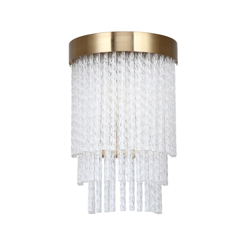 Металлический каркас цвета латунь, каскадная конструкция, декор из закрученных вокруг своей оси стеклянных трубочек.