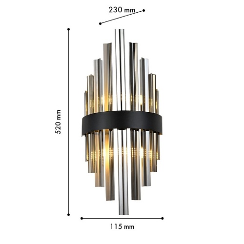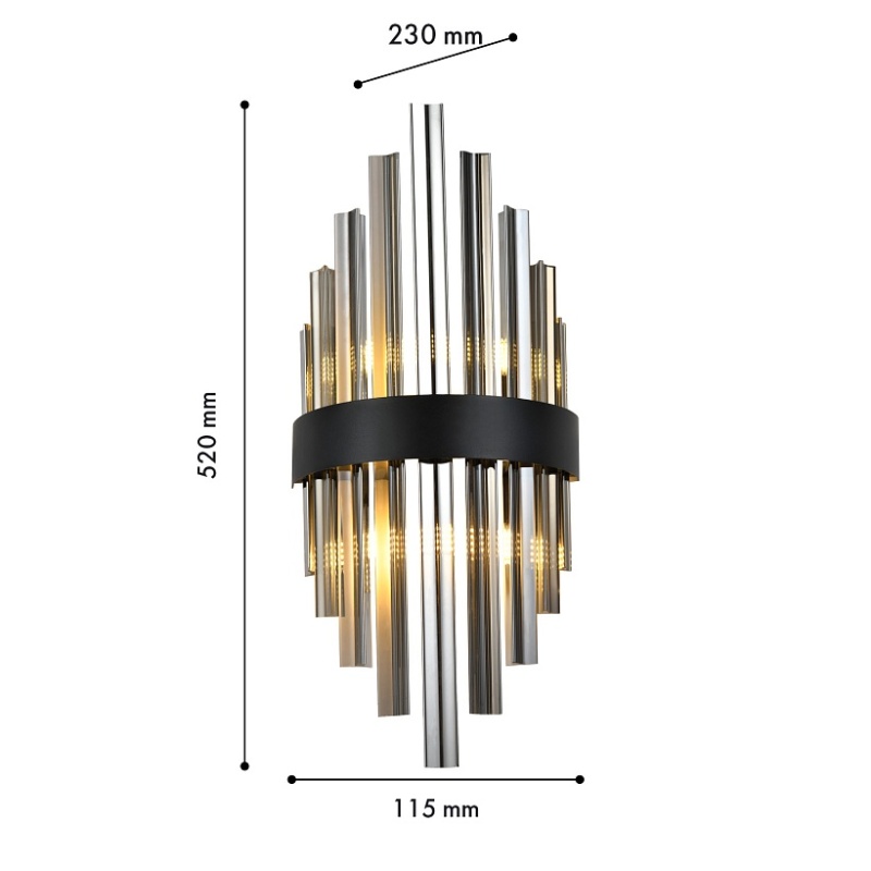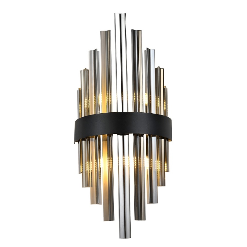 Металлический каркас в черном цвете, дымчато-серый хрусталь, встроенная лента LED.