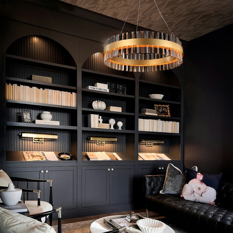Металлический каркас в золотом цвете, дымчато-серый хрусталь, встроенная лента LED.