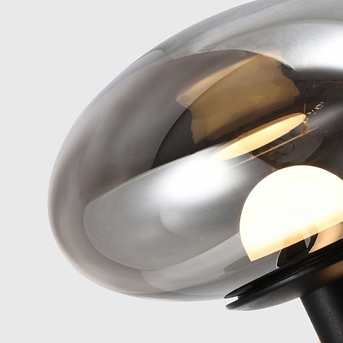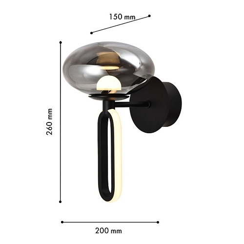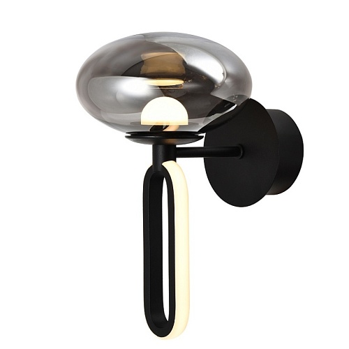 Металлический каркас в черном цвете с выдувным стеклянным плафоном, внутри расположен LED-модуль с закругленным акриловым рассеивателем, декоративный элемент с LED-лентой по внешнему периметру.