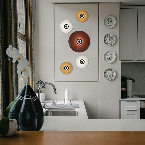 бра диаметром 22 см, выполнен в белом цвете, модуль LED, свет направлен наружу из центра диска, а также внутрь плафона.
