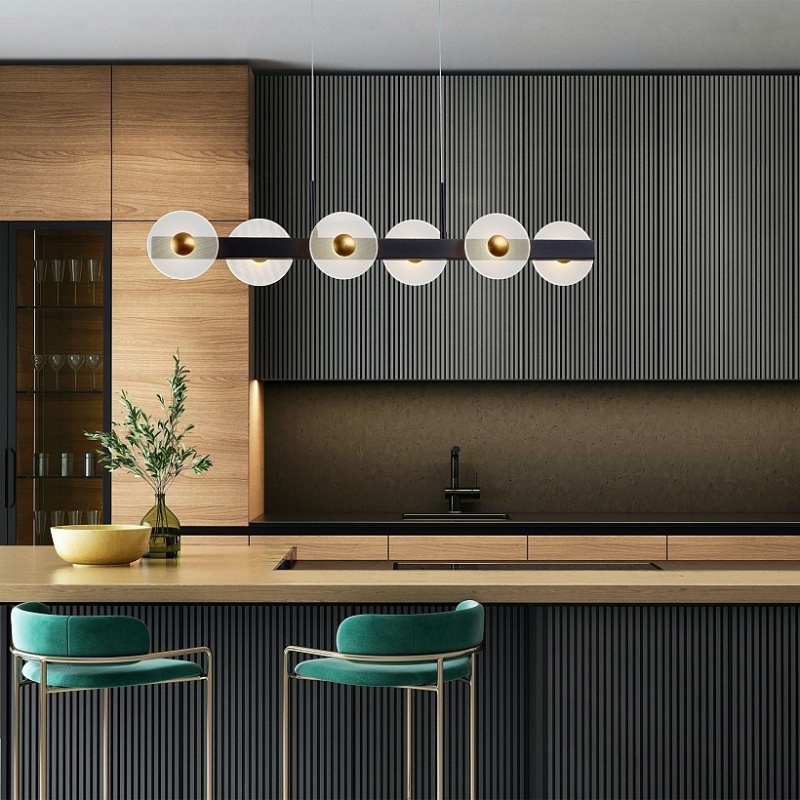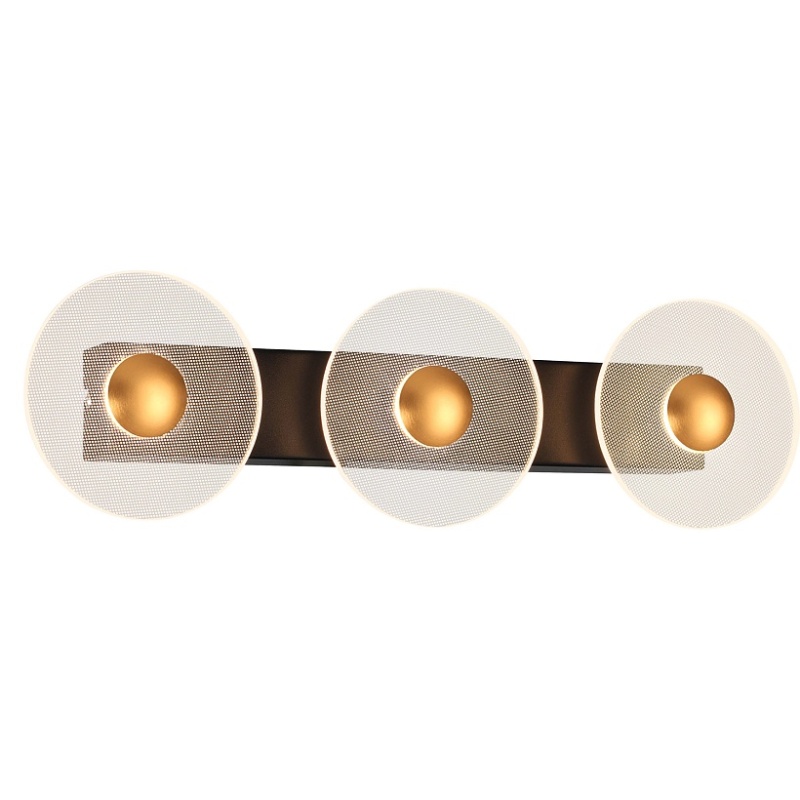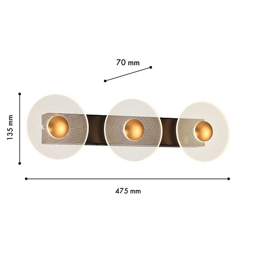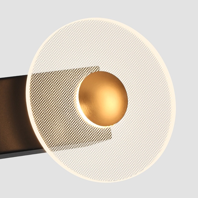 Каркас черного матового цвета, цилиндрические плафоны из акрила с узорным паттерном в виде белых точек, латунный элемент в центре. По внутреннему периметру диска на стыке с плафоном расположен LED-модуль.