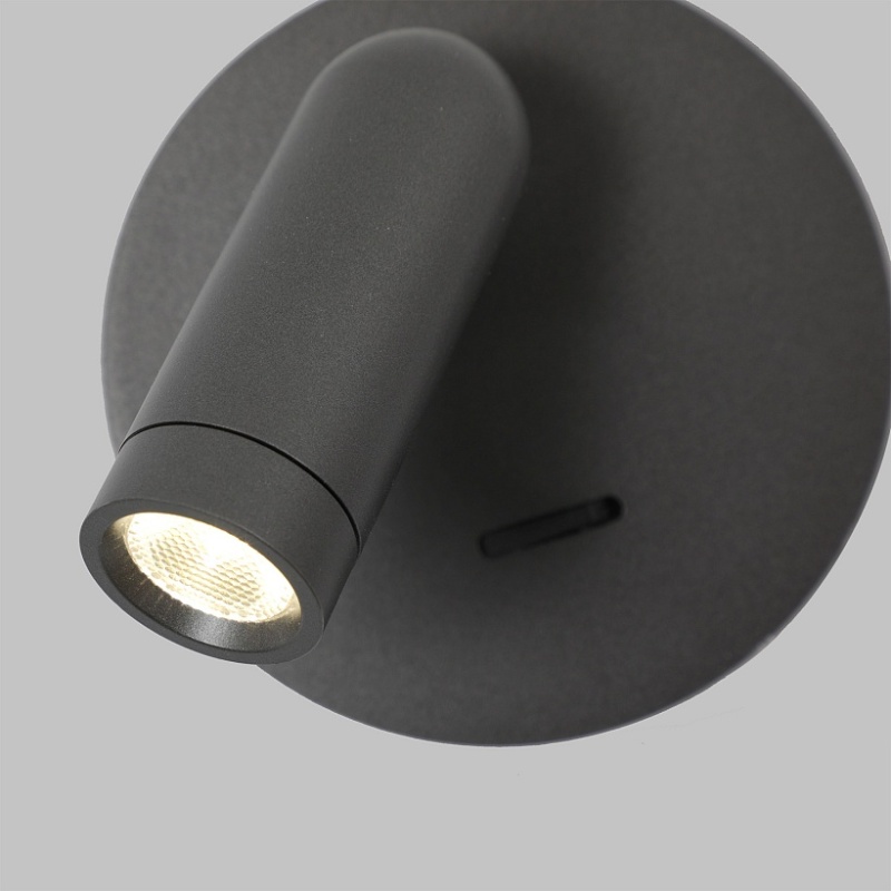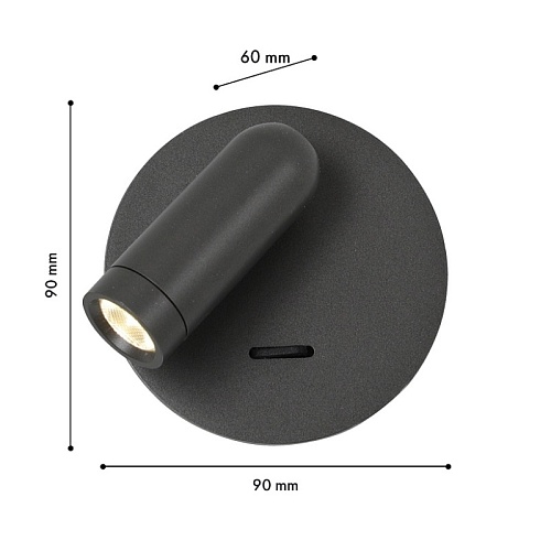 Каркас в сером цвете, поворотный плафон, выключатель в виде кнопки на корпусе, модуль LED, угол поворота 90° и 350°.