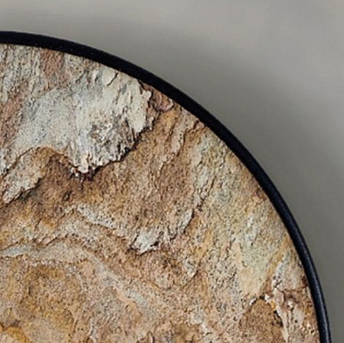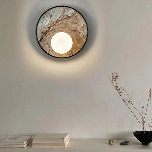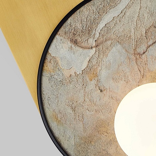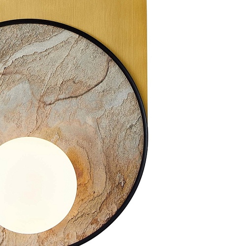 Каркас из металла цвета латунь, стеклянный плафон белого матового цвета, декор из натурального камня "зеленый песчаник" в окантовке из металла черного матового цвета, сменная лампа G9.