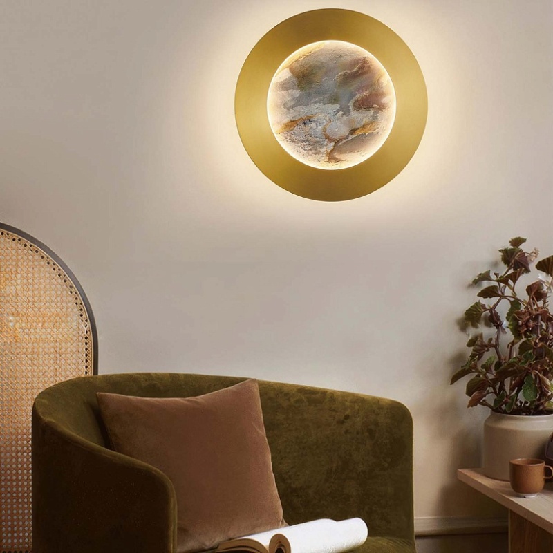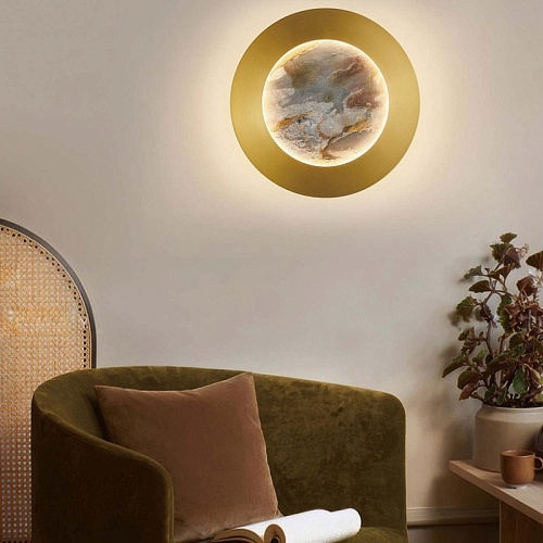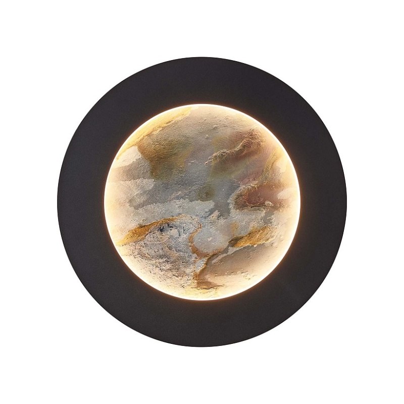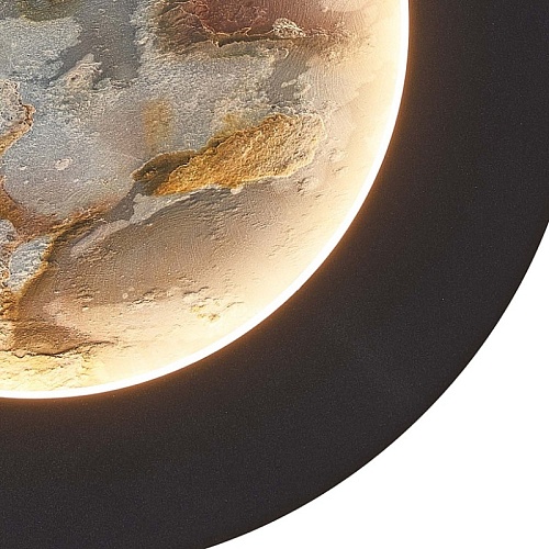 Металлический каркас в матовом черном цвете, белый рассеивать из акрила, лента LED по периметру декоративного диска из натурального камня "зеленый песчаник" и на задней поверхности.