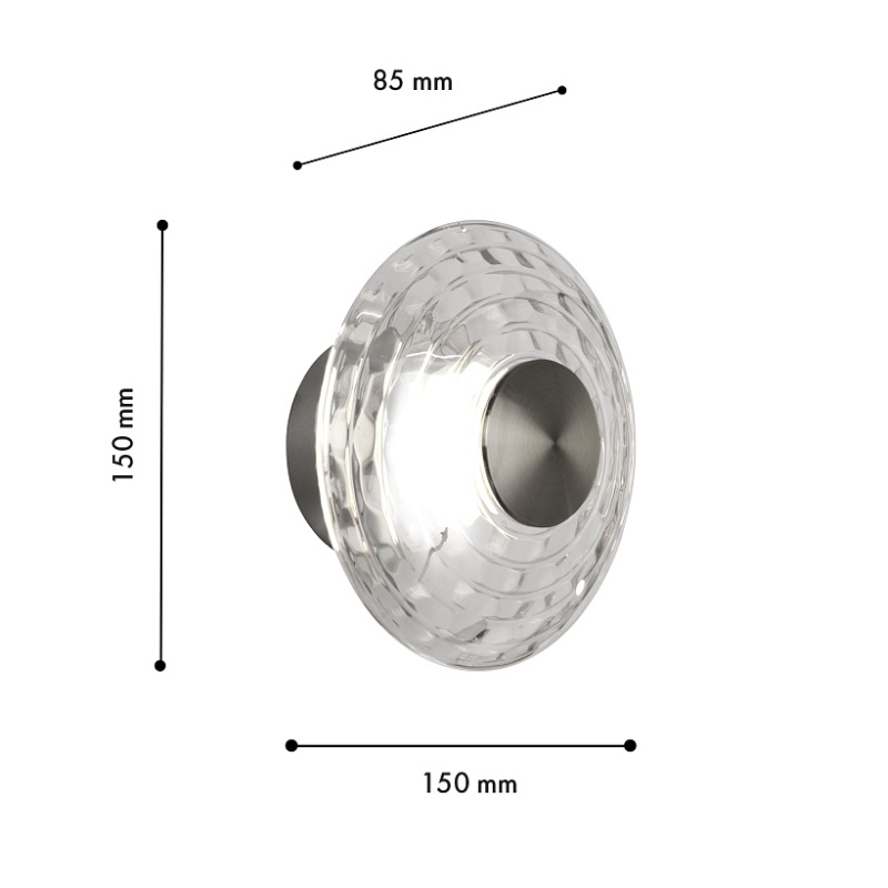 Металлический каркас цвета матовый никель, закругленный фактурный плафон из прозрачного стекла, LED-модуль.