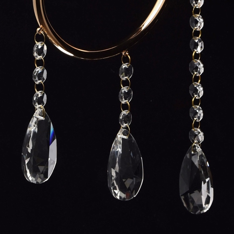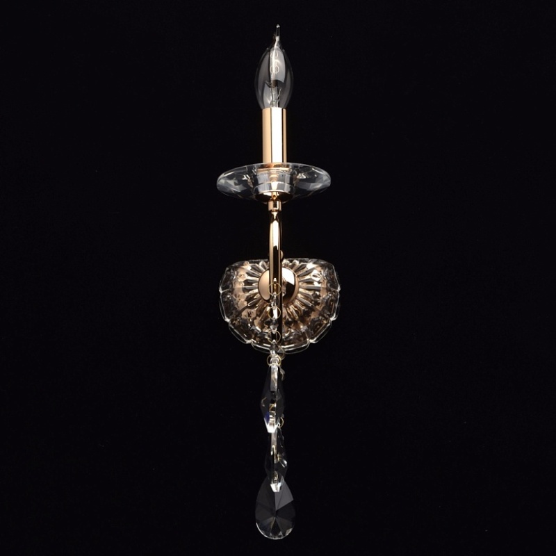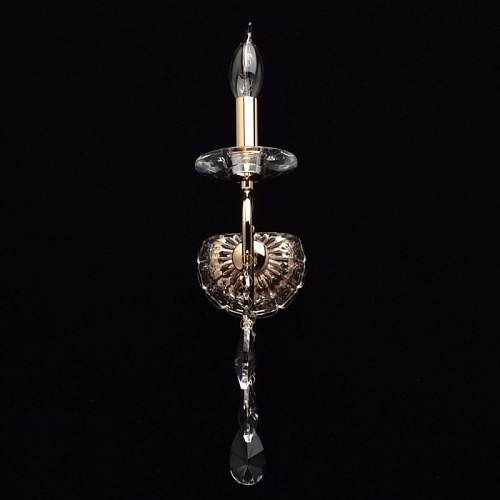 Основание бра: металл, гальванизировано в цвет французского золота. Рожок и декоративный элемент выполнены по технологии проката на роликовом станке. Декоративная розетка выполнена из массива хрусталя. Основание закрыто декоративной розеткой из стекла, отлитого в сложную форму. Светильник декорирован подвесками из хрусталя высокого качества формы октагон и миндаль.