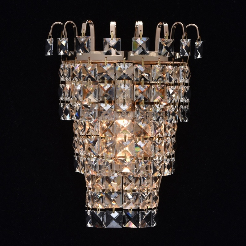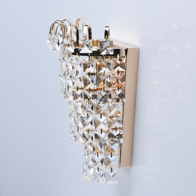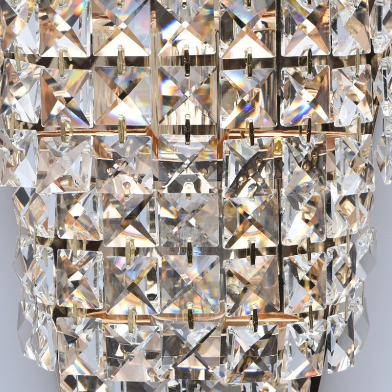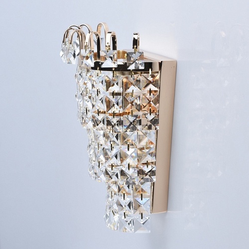 Основание бра выполнено из металла и гальванизировано в цвет золота. Светильник декорирован прозрачным хрусталем квадратной формы.